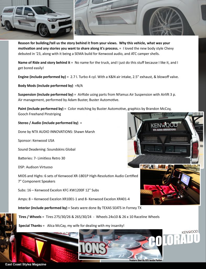Share This Post Feature / Featured News / Featured Slider Kenneth McCay’s 2023 Chevy Colorado By Ecsmagazine on March 10, 2026 No Comments Click Here To Purchase Click here to Purchase Share This Post Related Articles Matt Rossi’s 2017 Ford F-250 aka ” DMX Truck “ June 30, 2021 Ely Ortiz 1999 VW Golf February 21, 2018 Mr Untouchable’s 2015 Jeep Wrangler unlimited custom March 3, 2020 Luis F Salas 1991 Chevy C3500 Crew Cab Dually July 6, 2023 Danielle Hamilton’s Radical 1992 Chevy s10 July 8, 2024 James Cavallaro’s 1998 GMC Sonoma December 28, 2025 Jason Welliver’s 1994 Toyota Pickup October 29, 2020 Carl & Lynda Spivey’s 1992 Ford Thunderbird July 1, 2018 Nancy Thayer’s 1992 Mitsubishi Mighty Max July 7, 2025 Leave a Reply Cancel ReplyYour email address will not be published. Required fields are marked *CommentYou may use these HTML tags and attributes: <a href="" title=""> <abbr title=""> <acronym title=""> <b> <blockquote cite=""> <cite> <code> <del datetime=""> <em> <i> <q cite=""> <s> <strike> <strong> Δ